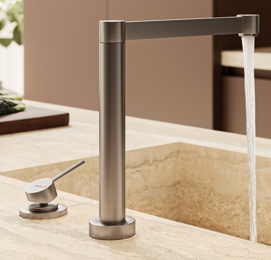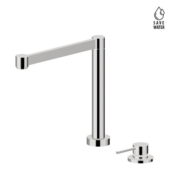Gruppo miscelatore monocomando per lavello con bocca abbattibile. Flessibili di alimentazione F3/8”. Cartuccia da 25 mm a dischi ceramici.