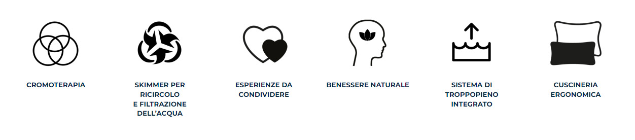 Capacità e comfort: La vasca è pensata per accogliere più persone, offrendo uno spazio comodo per il relax e il benessere, con un'ergonomia studiata per supportare la postura durante l'uso.